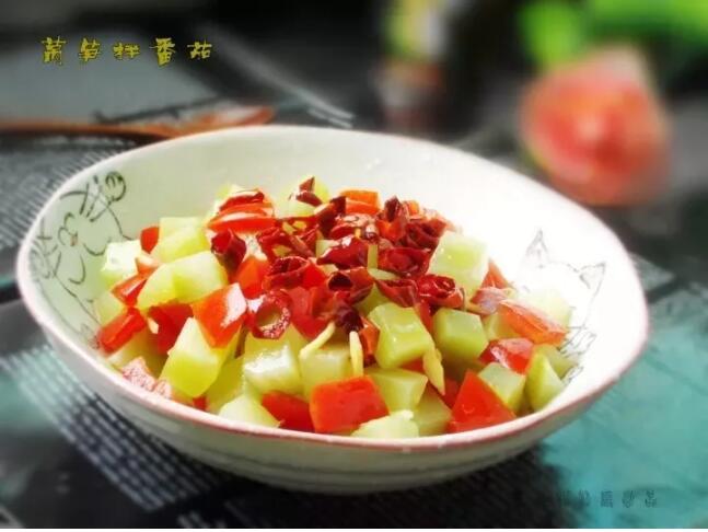 1. 萵筍去皮切小塊;番茄去籽切小塊;2. 姜切絲;辣椒切小圈;3. 萵筍、番茄、姜絲裝盤,加醋、鹽、鮮蔬粉拌勻;4. 鍋中加2匙油,放入辣椒炸香;5. 然后將辣椒油一起倒在萵筍番茄上即可。