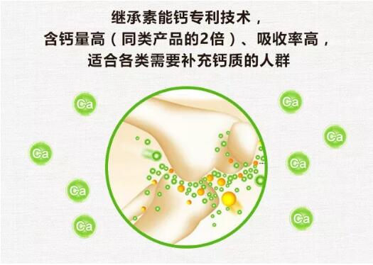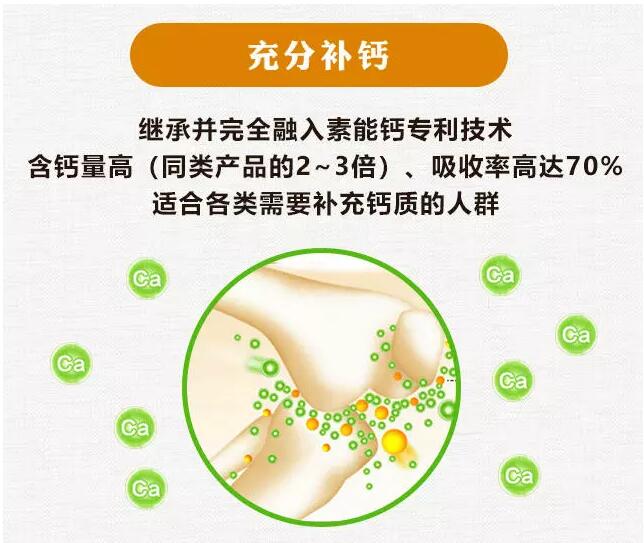 繼承素能鈣專利技術(shù),含鈣量高、吸收率高,100多種食材搭配,讓鈣更好吸收,營養(yǎng)更全面,適合各類需要補充鈣質(zhì)的人群;