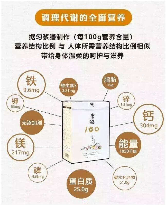 2016年,在“素能鈣”基礎(chǔ)上,廣州橄欖樹推出升級產(chǎn)品“素貓160”純素食全餐養(yǎng)生粉,在素能鈣配方基礎(chǔ)上,加入100多種植物原料,有效解決了營養(yǎng)平衡問題。